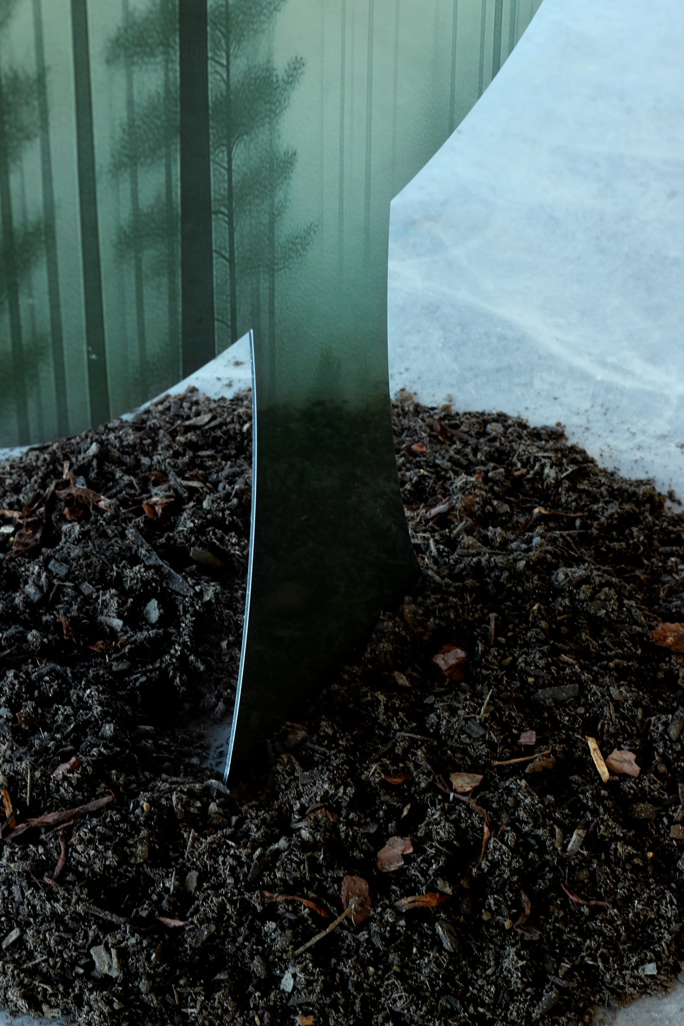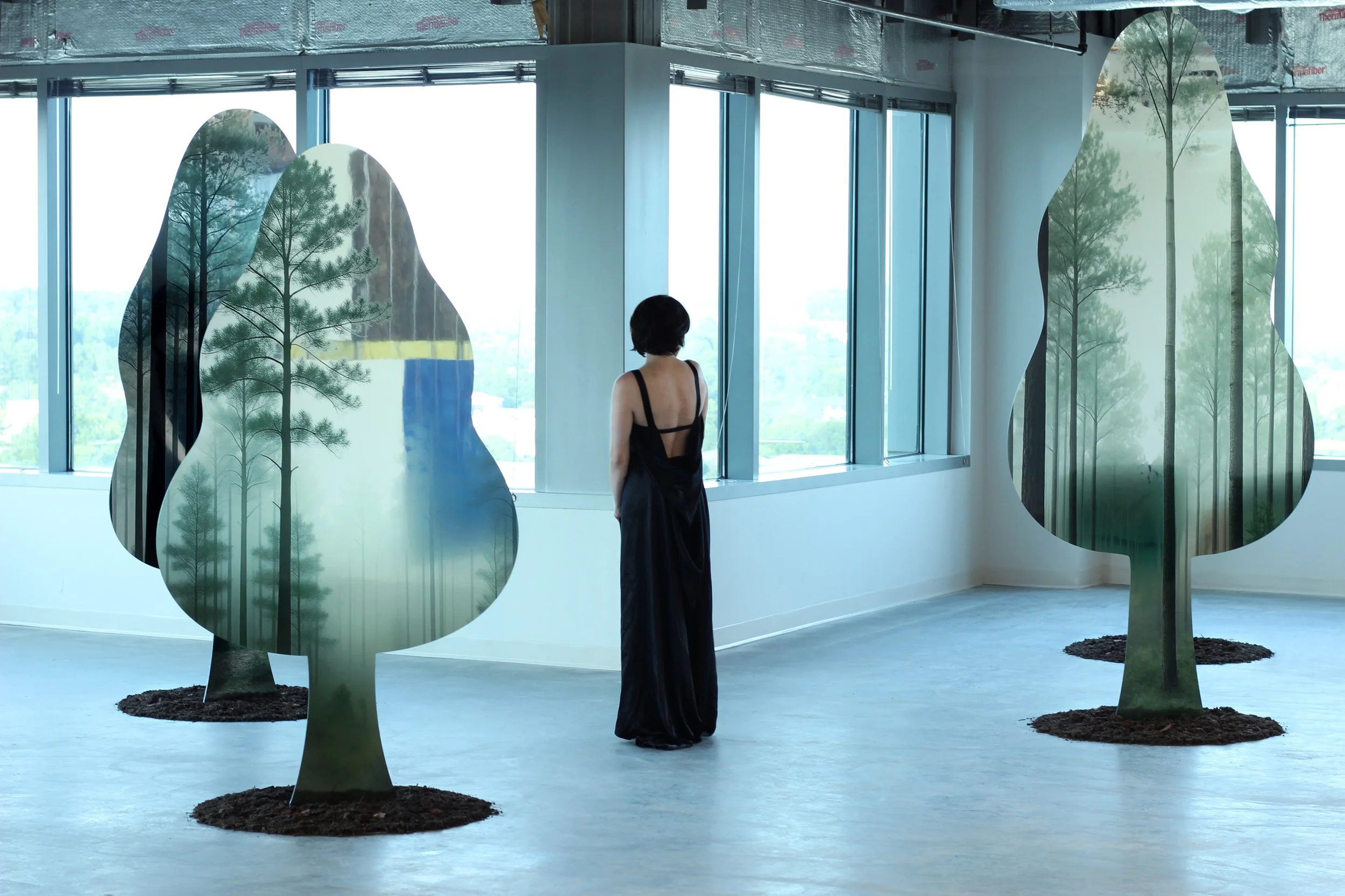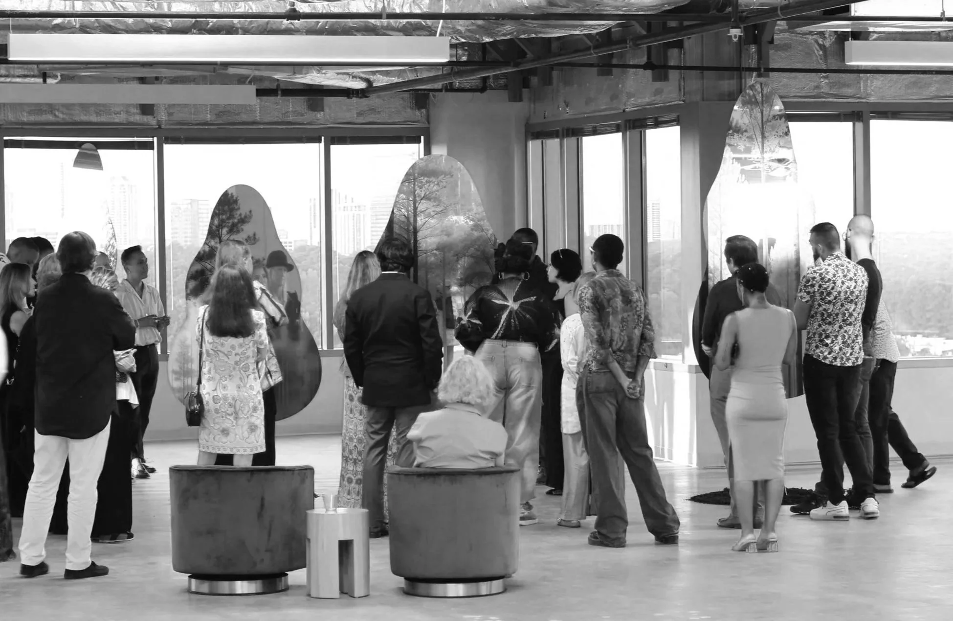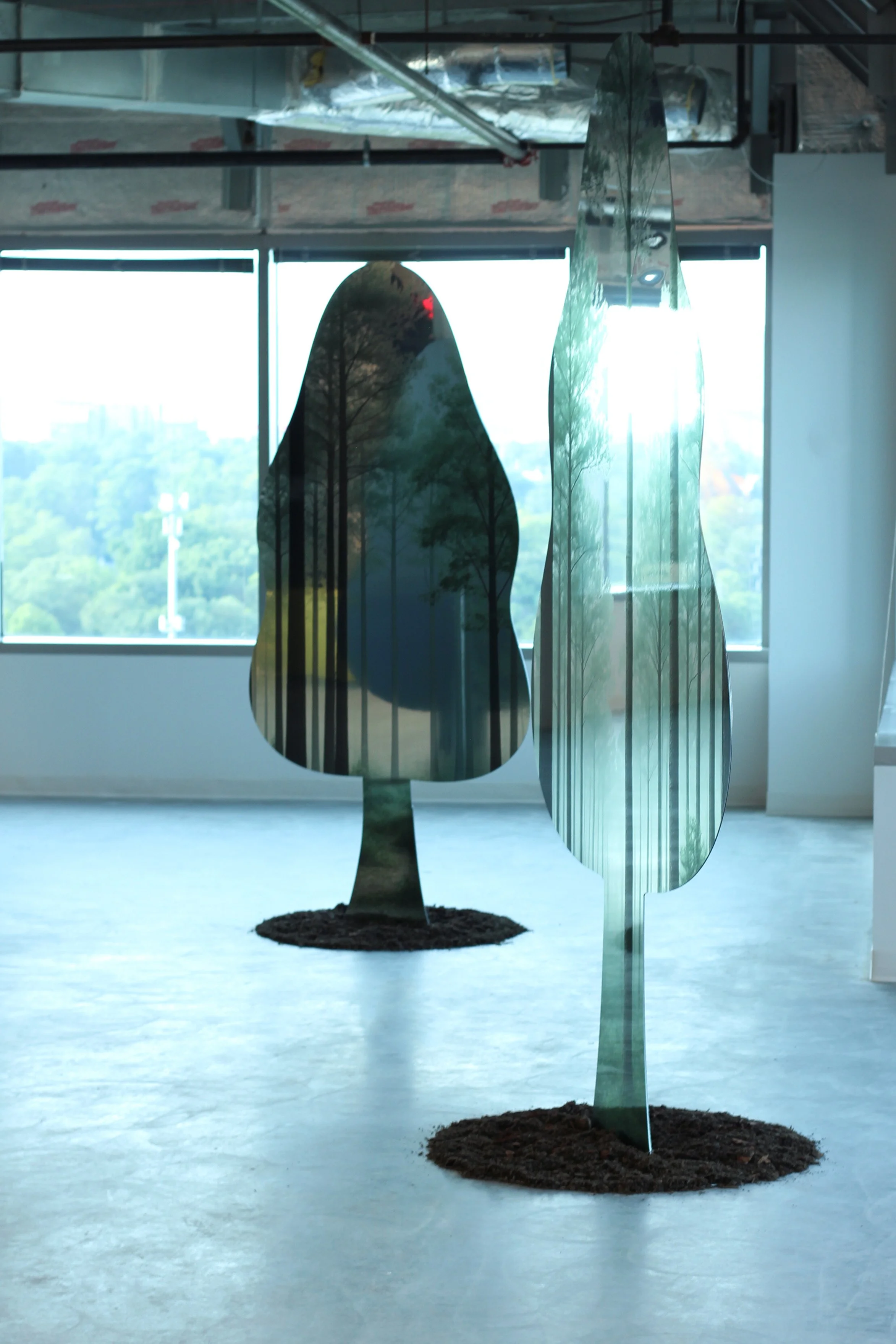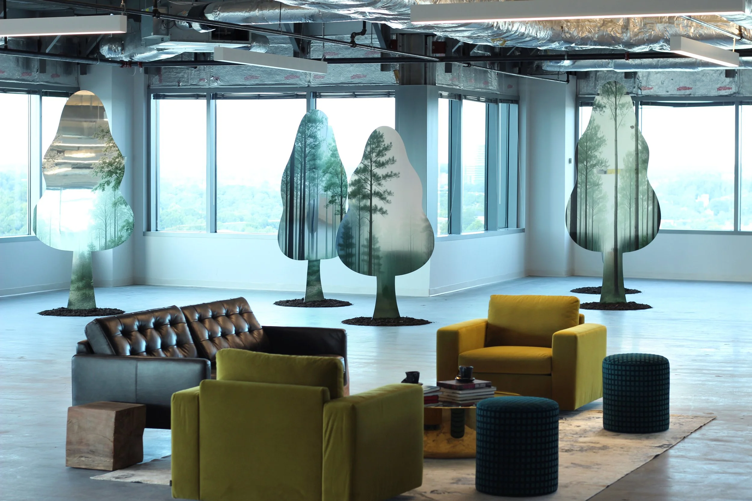 Synthetic Grove: Social ecology 01 is a site-specific installation developed by Pilar Studios and presented through the Hambidge Center’s Hive program at Uptown Atlanta. The project was installed on the fifteenth floor of a high-rise structure overlooking the Atlanta skyline, occupying a panoramic architectural environment positioned between interior exhibition space and the surrounding urban landscape.The installation is composed of Luminux mirrored metal panels, cut into abstracted foliage silhouettes and arranged to form a walkable, reflective grove. Each panel is UV-printed with AI-generated imagery derived from the Hambidge Center’s property, integrating site-specific ecological references into an industrial reflective surface. As viewers move through the installation, reflections of the city, the body, and the printed imagery continuously shift and overlap, collapsing distinctions between observer, environment, and representation.Synthetic Grove was developed as the first physical realization of Pilar Studios’ Second Nature framework, which examines environments produced through human industry and perception as continuations of natural systems. The installation was produced specifically for its architectural and geographic context, responding to the scale, light conditions, and visual openness of the site. By situating a constructed grove within a corporate high-rise, Synthetic Grove places representations of nature inside contemporary systems of development, infrastructure, and institutional space.