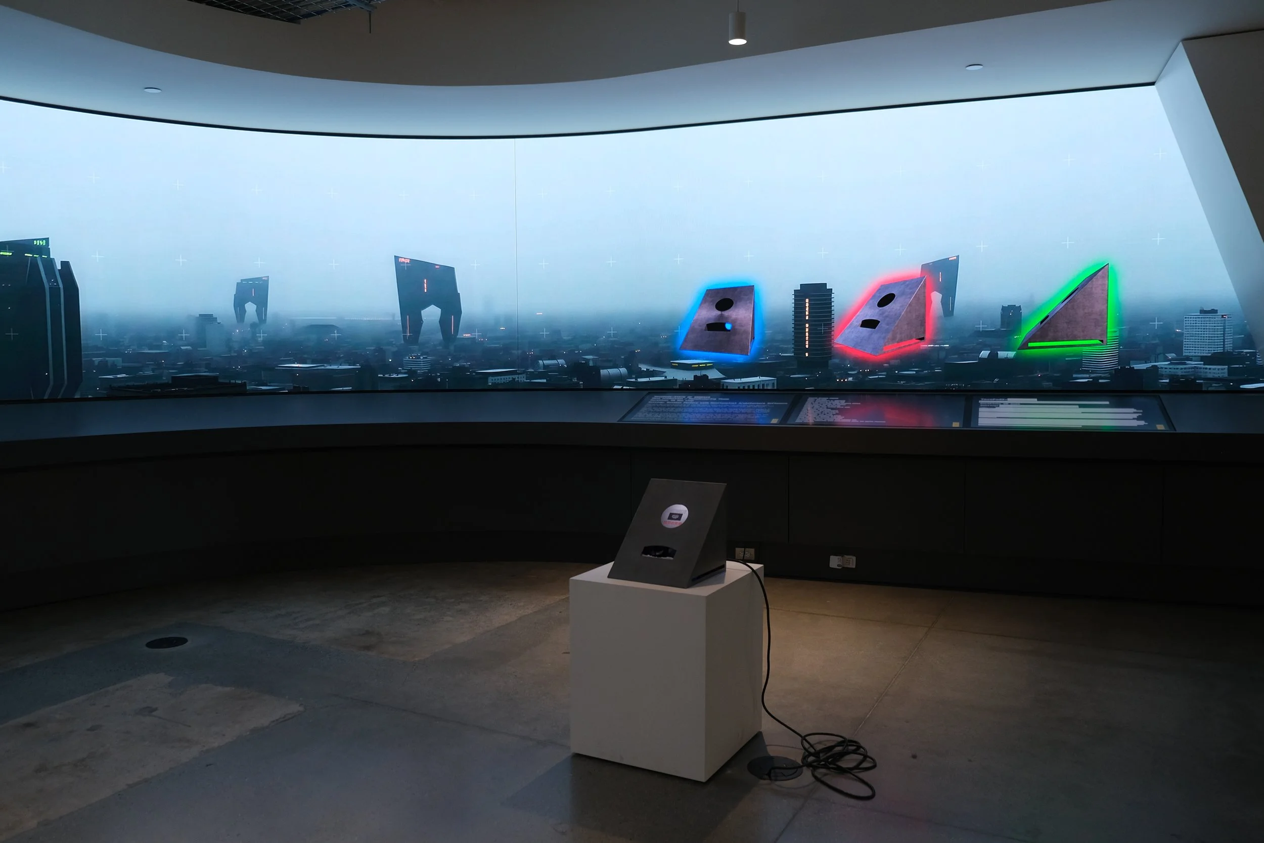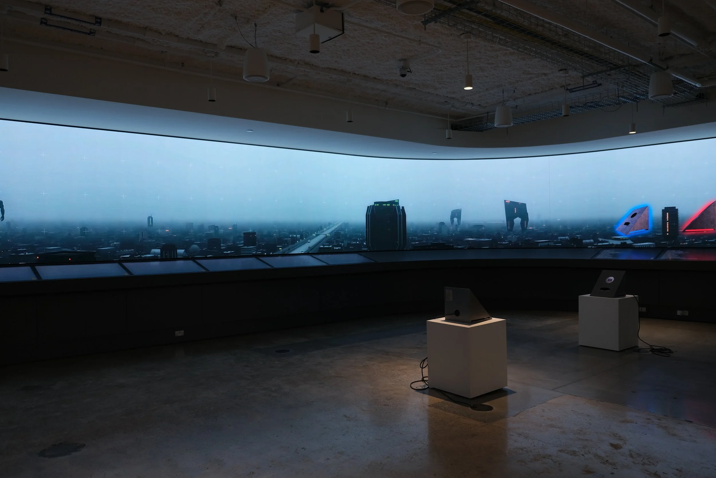 Technoterria is an interactive exhibition developed by T.W. Pilar (Pilar Studios) in collaboration with Ivan Reyes and presented at the Georgia Institute of Technology Library’s Interactive Media Zone in Atlanta from March 2025 to January 2026. The project operates as a site-responsive digital installation combining large-format panoramic screen environments, interactive sculptural interfaces, and custom audiovisual systems. Framed as a speculative retrospective set one hundred years in the future, the exhibition examines the long-term normalization of technological, industrial, and socio-economic systems through public interaction and spatial engagement. Technoterria was intentionally situated within an academic research environment to contextualize emerging technological futures alongside education, infrastructure, and institutional production. Read MoreOverview